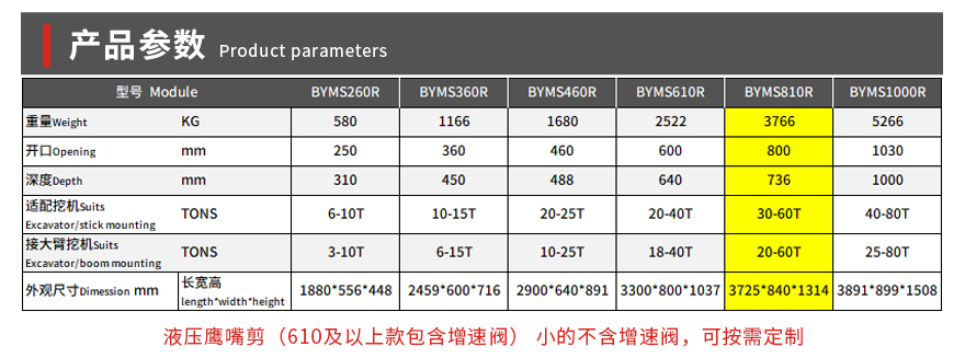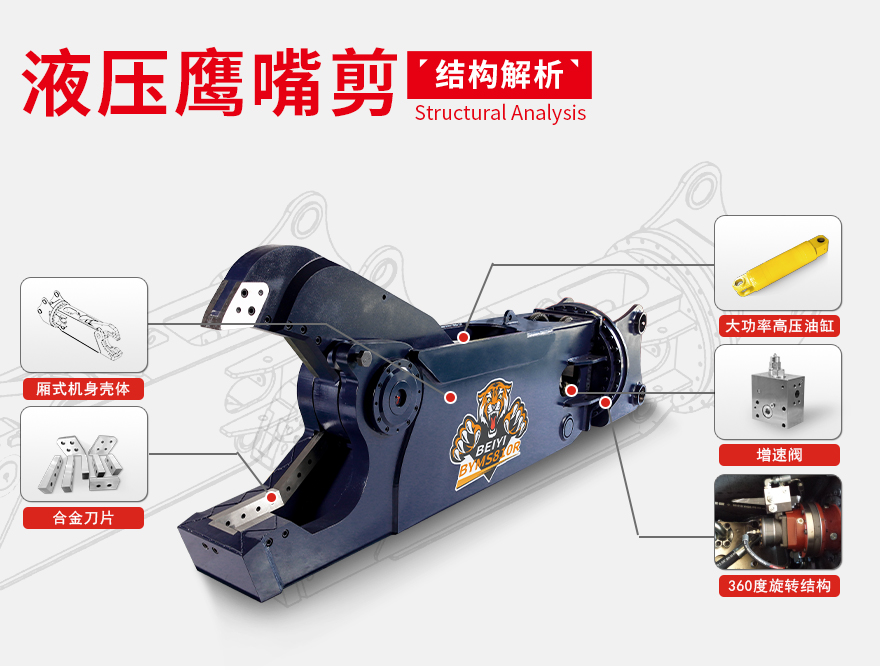 鷹嘴剪,別名液壓剪,屬于挖掘機拆樓屬具,安裝于挖掘機前端。因其酷似鷹的嘴巴而得名,能精準快速抓取解體目標。刀口設計有夾槽,鉗夾力強勁,便于夾緊不規則物料時行任意角度互換設計。鷹嘴剪從結構組成上可以分為刀頭、刀身、尾座三個部分。整體采用特殊合金鋼鍛造,刀片采用特殊合金鍛造。