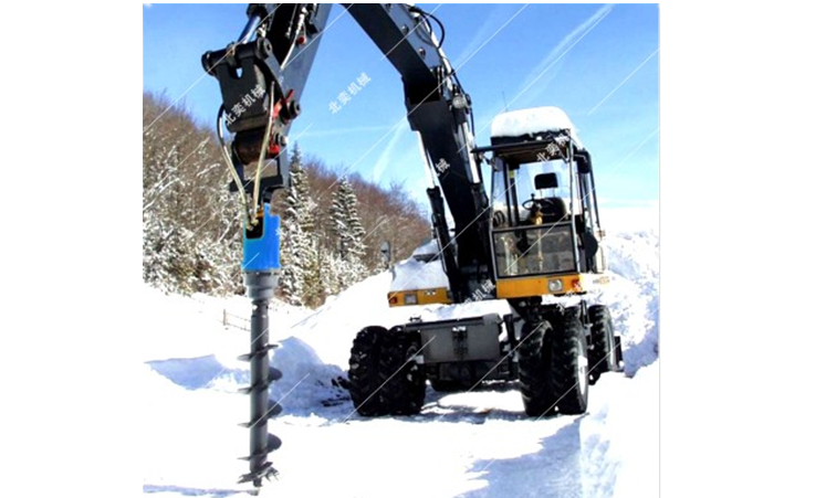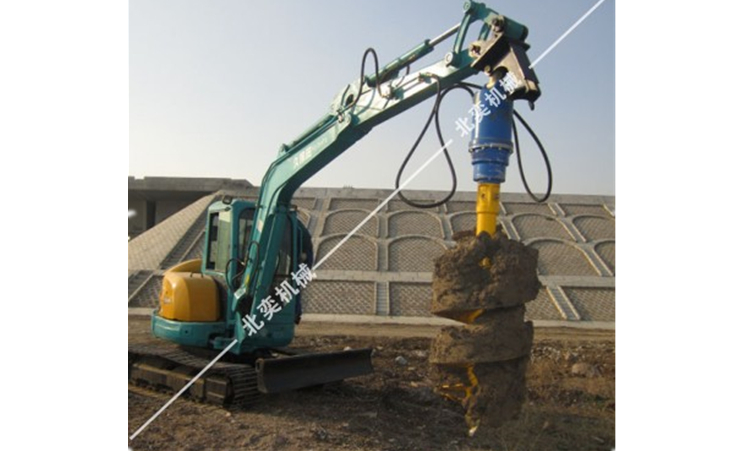 螺旋鉆機-安裝于挖掘機上使用,不含挖掘機,用于挖坑、太陽能管樁引孔或打螺旋地樁,主要由驅動頭和鉆頭組件構成,驅動頭與鉆頭組件固定連接,鉆頭組件包括鉆桿、包繞著鉆桿的螺旋葉片、以及設置在鉆桿末端的鉆頭或者螺旋地樁,所述的螺旋葉片的底端設置有鉆齒。結構簡單、穿鑿能力更強、生產運用成本低、靈活性高。